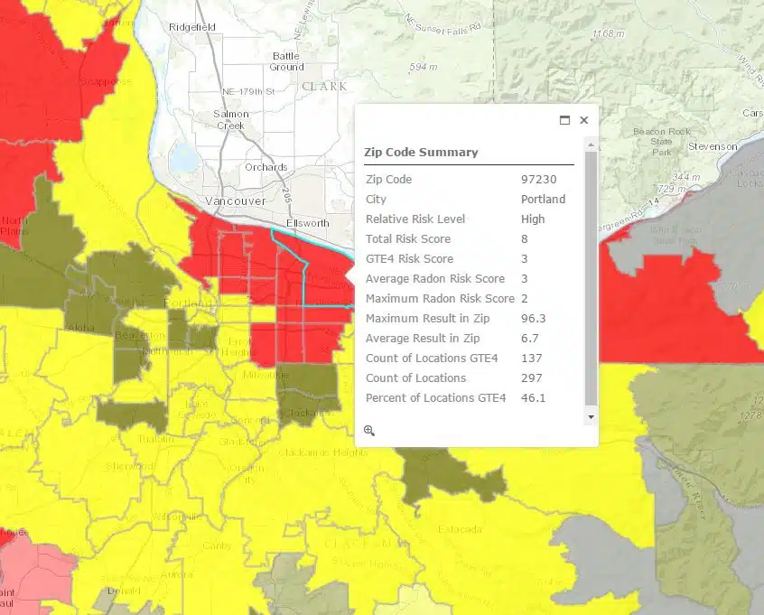 Click on the link to head over to the radon map, where you can click around Oregon and Portland to find the risk for radon in any zip code that has had enough tests done.
