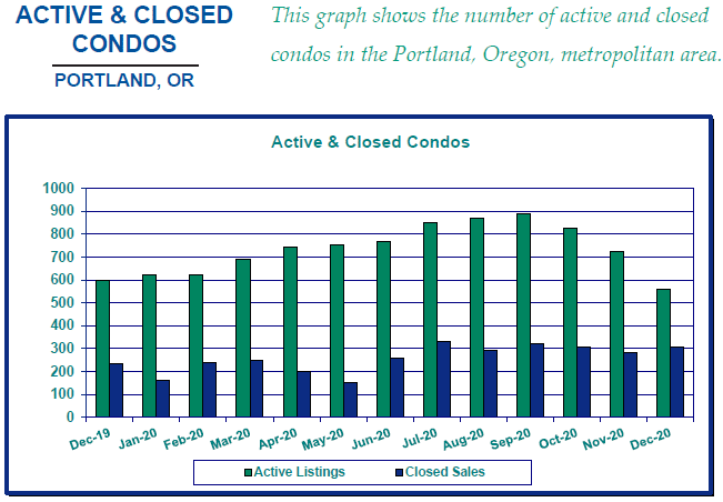 - Condos finished better in 2020. As in all Portland market sectors, it was a rough spring, with buyer activity tanking in March. But things picked up again in summer, and the peak month for 2020 condo sales was September, when nearly 900 were sold. Numbers stayed strong through the remainder of the year, and the number of condos sold in the second half of 2020 was overall a pretty close match to the activity in 2019.