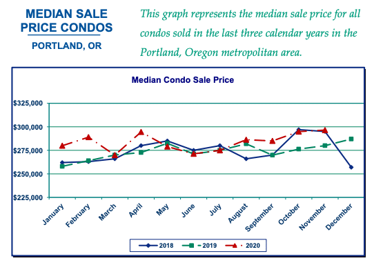 4. Condos fluctuate seasonally. As you can see from the above chart from the RMLS, the median sale price for condos (in a normal year) follows many of the seasonal ups and downs of the regular housing market. However, with strong economic growth in 2019, there were some changes to the pattern – no late summer or late winter dip in the median sale price, for instance. The year 2020 started out strong but saw a readjustment back to 2019 price levels after the beginning of the pandemic. However, the market seems poised for solid growth in 2021.