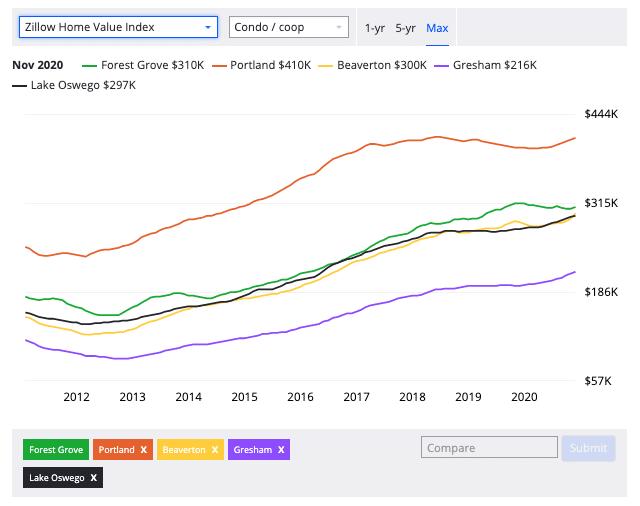 2. Condos span the price gradient. As you can see from the chart above, there are condos available across the Portland metro area in a range of prices. To generate your own graph showing change in condo prices over time (based on Zillow’s Home Value Index), go to https://www.zillow.com/home-values/ and type your city, zip or neighborhood of interest in the search bar. Then scroll to the “Market Overview” section and select condo/co-op from the drop-down menu.