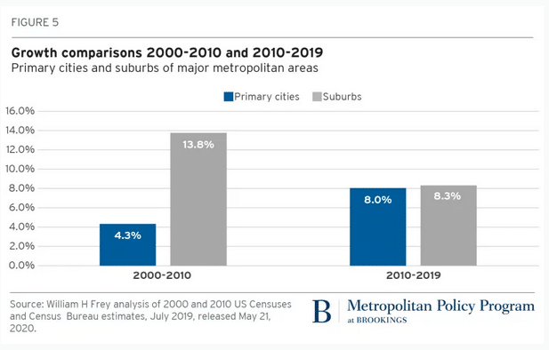 While the narrative that millennials gravitate toward cities persists with reason, national numbers give no reason to expect city growth to be higher than suburban growth. Certainly, cities have made a great leap in popularity over the past decade. That the once booming suburbs took a hit is clear. But the Brookings Institute’s numbers still have the suburbs slightly edging out their primary cities’ growth rates over the course of the decade.