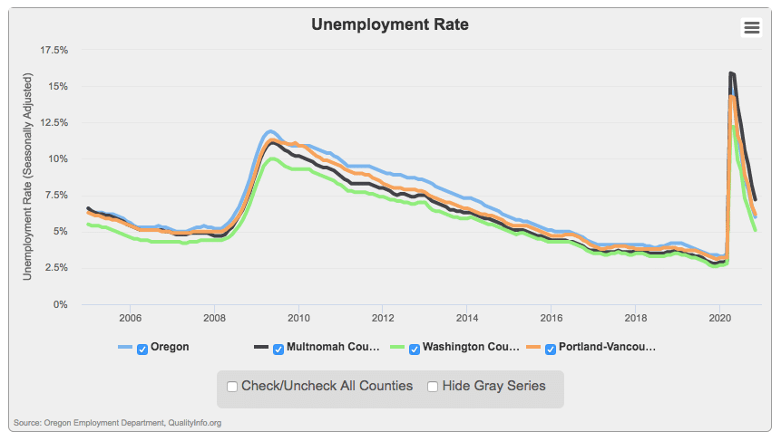 Amid all that worry, however, some encouraging statistics have emerged. According to the Josh Lehner, writer at the Oregon Office of Economic Analysis, 2020 did not see a significant drop in the number of applications for new Oregon businesses. This means start ups are still holding strong. And data from the Oregon Unemployment Department shows that the unemployment rate is falling much faster than it did after the last recession.