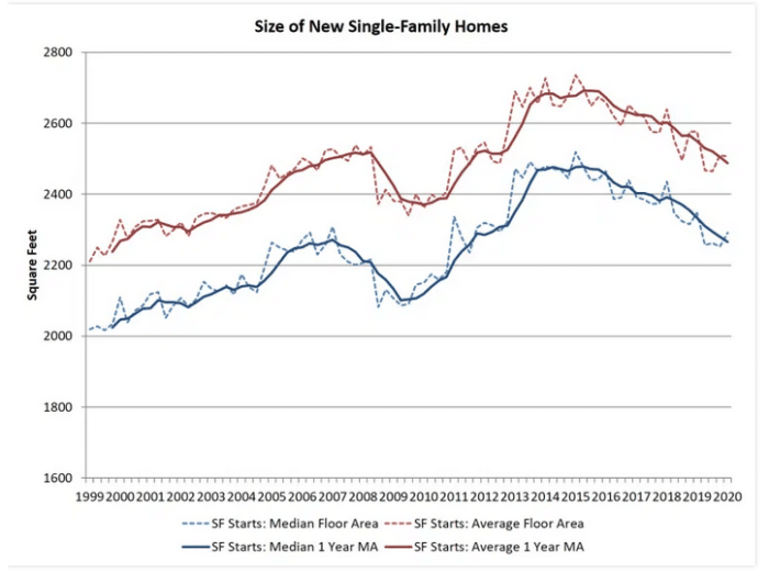 However, a slow decline in average floor area since about 2016 may indicate that the market is correcting itself to an overreaction. And yes, 2020 was certainly a difficult year for many. But we think it’s less likely that we’ll see a huge drop in home size. Those with the means to buy, in fact, likely will want larger and more versatile spaces. And now that folks are getting back to work, we could potentially see the first in home size in the coming months since 2016.