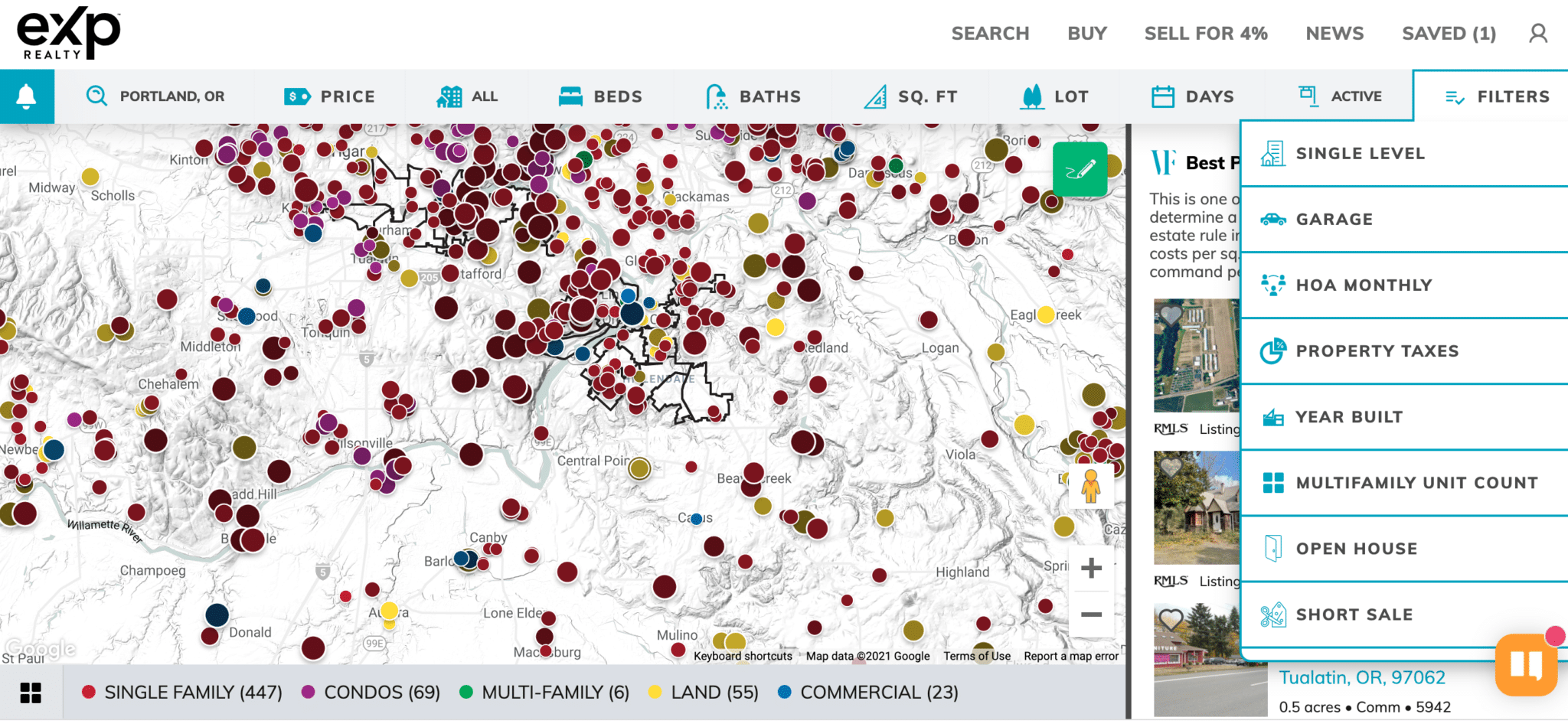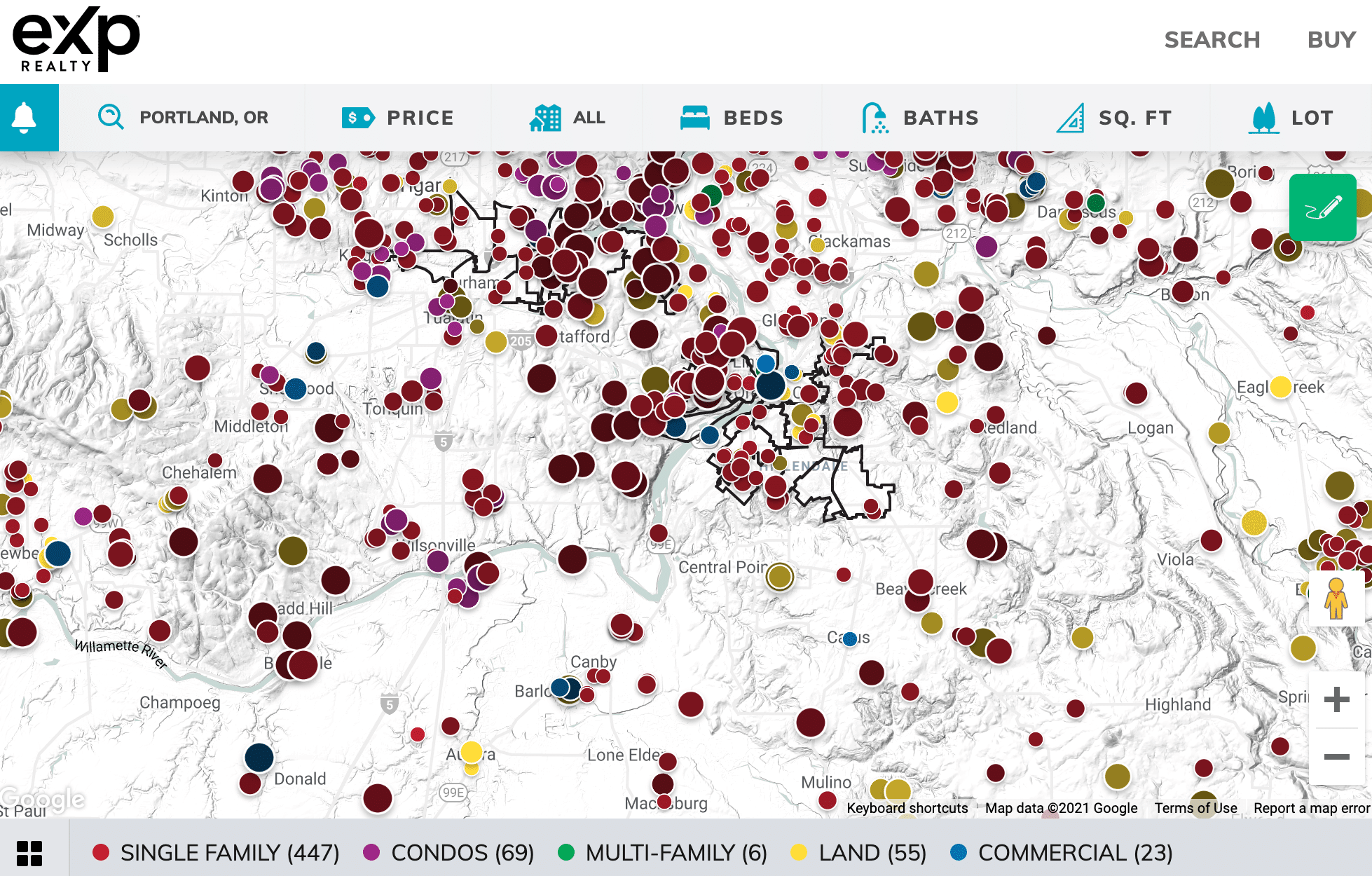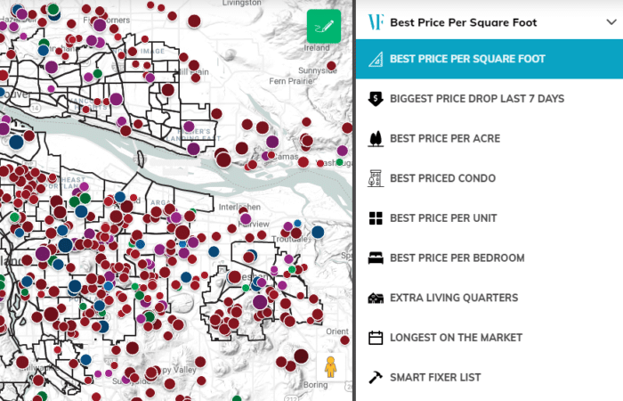 The new dynamic Portland real estate map has built-in and refined yet easy-to-use power filters. All it takes is one click to see, for example, homes with additional living quarters. Looking for a fixer as an investment property? One click for that, too. How about best price per acre of land or per multi-family unit? Once click for those, as well. Because the system direct connects with the local MLS, it can read and sort through every checkbox and it can also combine any keywords written about the property into smart lists.