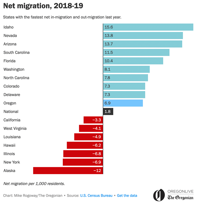Of course, people move to Portland from other states, too. Oregonlive.com reported that inward migration to Oregon between 2018-2019 was four times the national rate with people coming from a variety of states, as shown in the image below.