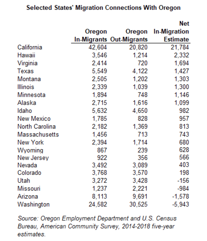 The table below gives an overview of Oregon’s in- and out-migration for 2014-2018. From it, we can see that even during this time period, most of Oregon’s net in-migration did, in fact, come from California.
