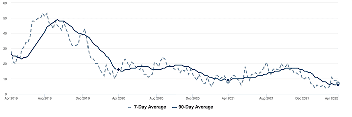 As with pretty much all towns and cities across Oregon and the U.S., inventory is low. This is certainly true for Troutdale, as the image below indicates. As we can see, the first significant drop occurred in response to the COVID pandemic and has remained low since, only getting lower with time.