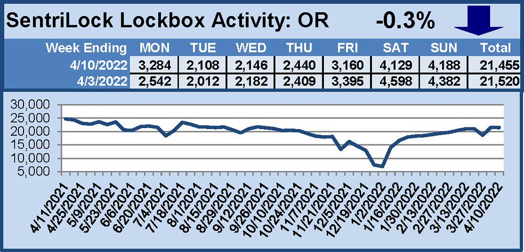 Looking back at March 2022, there were 20,400 MLS home showings in Oregon the first week, 21,006 the second, 21,073 the third, and 18,654 the fourth, or 81,133 showings total for the four week period.
