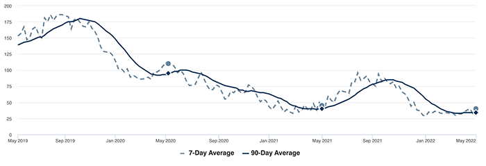 Oregon City inventory has continued to drop with the market seeing about 40 homes on average with no marked distinction between 7-day and 90-day averages.