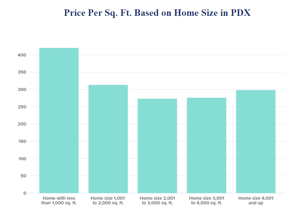 First, it is important to notice that no size of home sold for more per sq. ft. than the smallest homes on the market. This is true in part because those small homes represent the entry level pricing, the floor pricing, simply to obtain a home for yourself in Portland, Oregon. This is also true in part because a home itself has a certain value and expanding a home in size doesn’t equally expand the value of owning a home. There is a value to home ownership that goes beyond its price per pound. There is simply a certain low pricing ceiling required to purchase a home in a certain city (based on average wages and inventory levels).