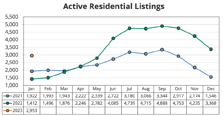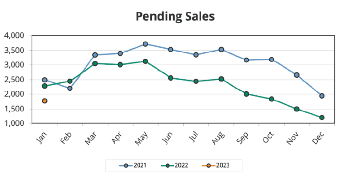 As you can see from the charts above, both inventory and buyer traffic (we have the actually numbers, just not in a handy chart format to share here) were low, as expected. Now, I fully expect the 2023 lines to follow the same patterns as the 2022 and 2021 lines above will (as the seasons have their effect). That means in Feb. (which I already know is happening) pending sales have increased slightly and so has inventory. Overall, Jan. always falls in the winter season, meaning relatively low inventory compared to the rest of the year and matching low buyer traffic. It is always possible to sell a home in Jan., it simply might take a while if the right buyer doesn’t come along. Generally speaking, it is a much better month to sell in than December of each year.