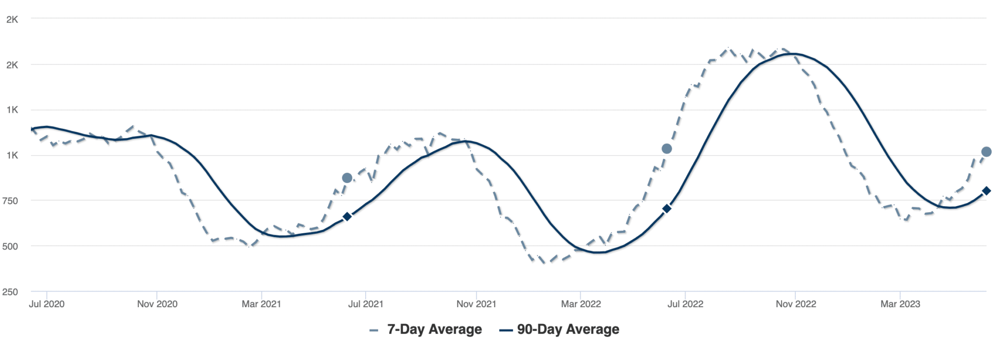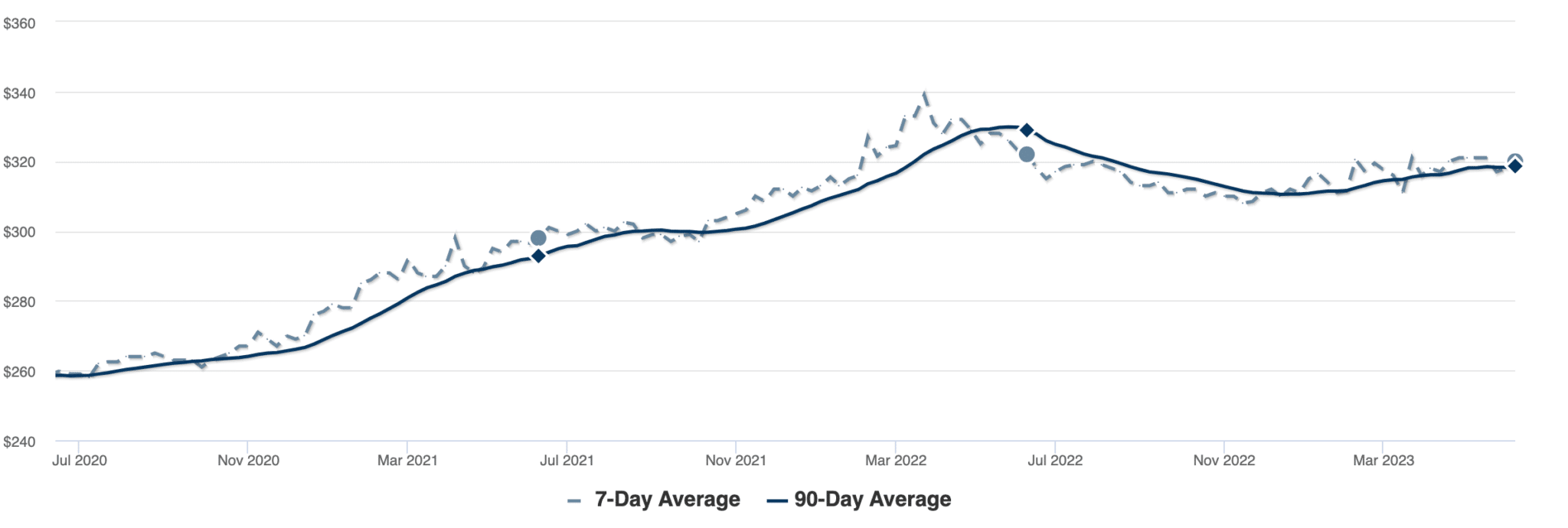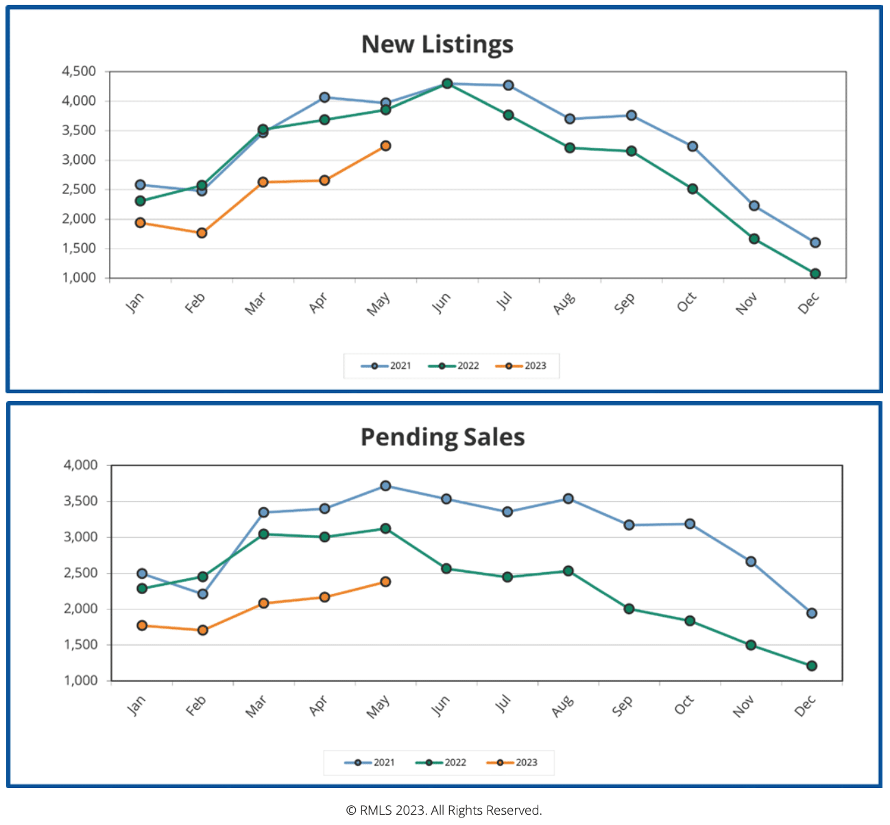 Pending sales continued to rise, as a result of a strong April and May selling season. As you can see in the comparison with 2021 and 2022 above, though listings and sales for 2023 have followed a similar trajectory, high mortgage rates have played a major role in this year’s cooler housing market.