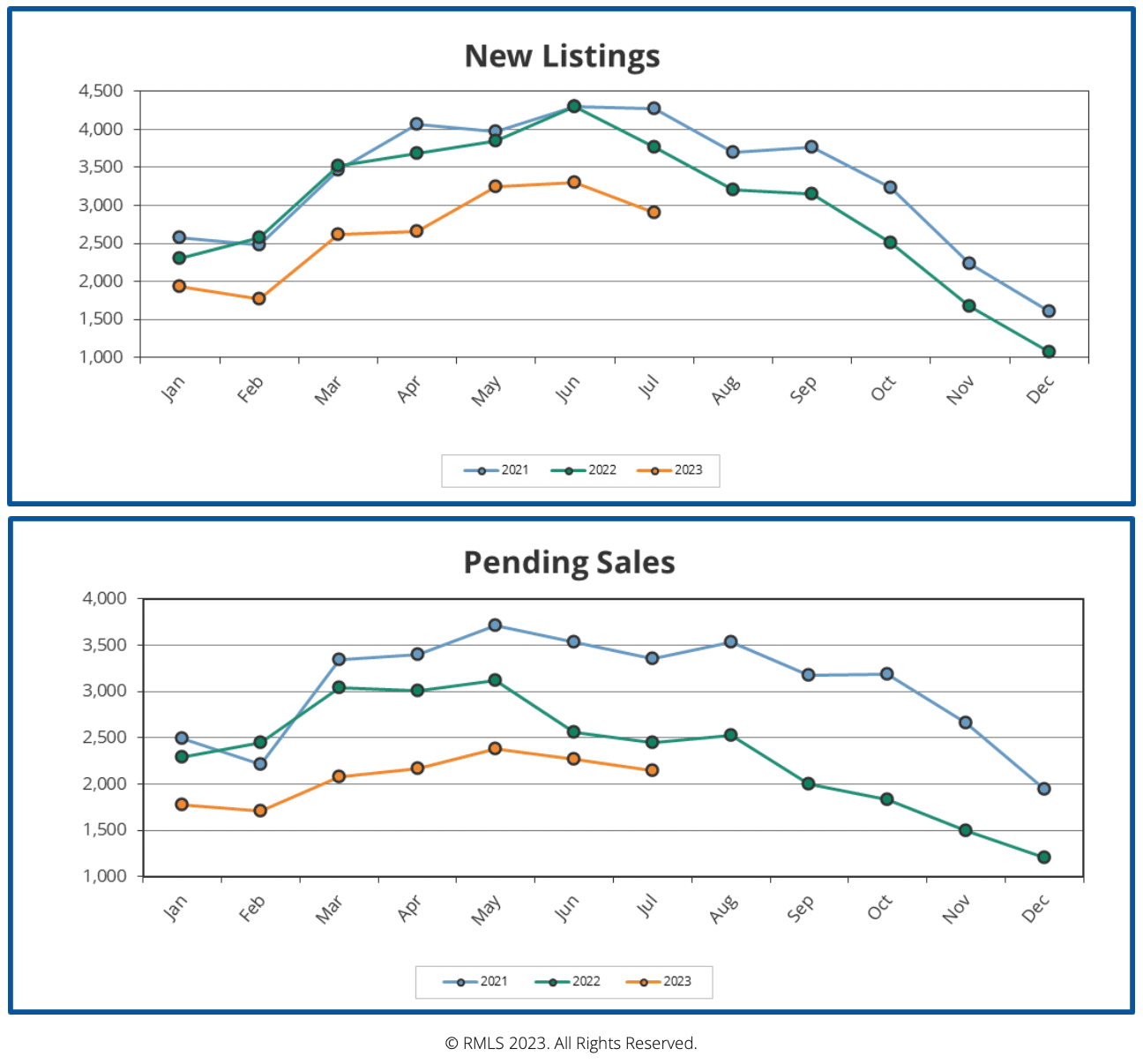 Both of the charts above demonstrate the reality that the housing market of 2023 was much less active overall than it has been in previous years, with a similar trajectory but much lower numbers of new listings and pending sales.