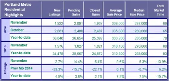 The good news is that these numbers are, for the most part, better than they were a year ago in November 2013. Particularly, closed sales were up 6.4% over last year, and pending sales were 14.4% higher! Inventory remains low, as it has all year, and there was no boost in new listings this November to help — in fact, new listings of Portland homes actually decreased 2.7% from last November.