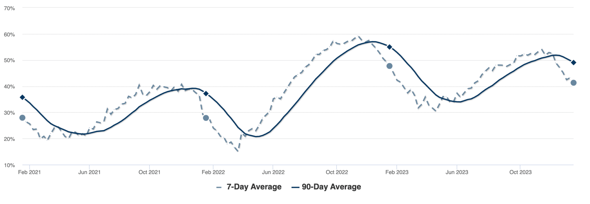Since our last report, fewer homes are experiencing price drops as our current low inventory is likely contributing to steadying prices. Approximately 41% of homes on the market have had price decreases, compared to 52% in December. This decline is consistent with the trend of diminishing price drops throughout the Winter in recent years demonstrated in the chart above, and we expect to see fewer price drops as we approach the Spring seller’s market.