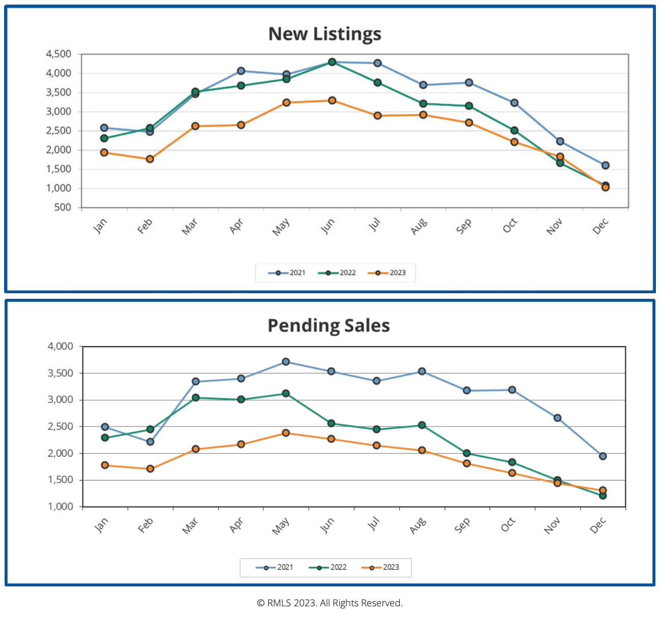 New home listings in December dropped at a rate similar to that of 2021 and 2022 and were nearly equal in number to the previous year. As illustrated by the top graph from RMLS, new listings in 2023 followed a similar trajectory to the previous two years with a steady overall decrease from the summer months onward. Now that the holidays are behind us, new listings will likely slowly increase as we draw closer to the spring season.