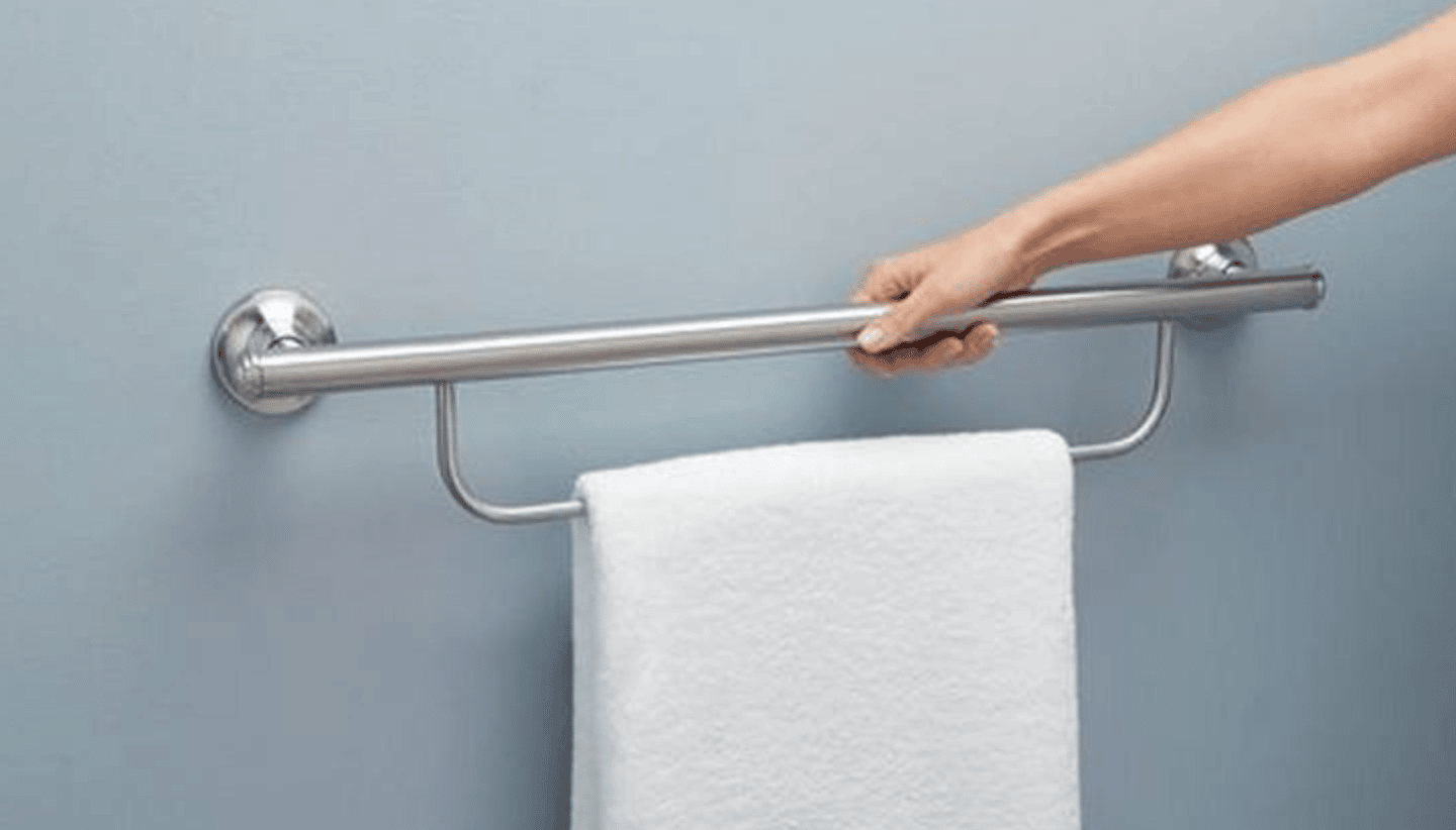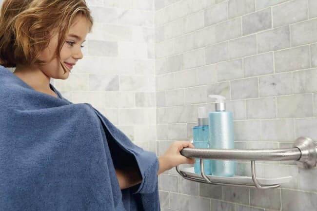 If that last item conjures images of thick silver bars with no aesthetic appeal, there are some on the market that can blend in and add to your chosen aesthetic, and some can serve dual purposes. For example, the combination grab bar and product holder below function well inside the shower and easily blend in without being overly obtrusive. Or this grab bar that doubles as a towel bar just outside the shower or tub.