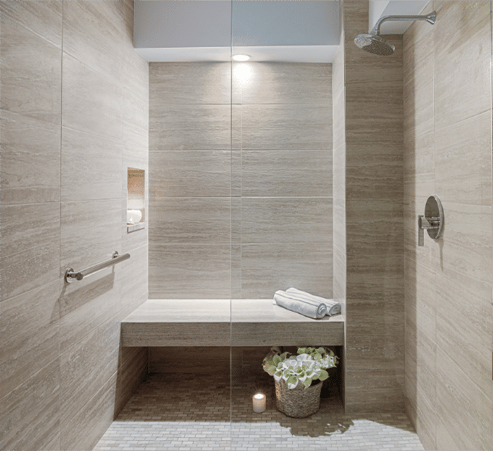 You can also install free-standing bamboo shower seats and bars with polished metals for a more modern aesthetic. Another option if you want to invest a bit more is new tile work in the shower that includes built-in seating.