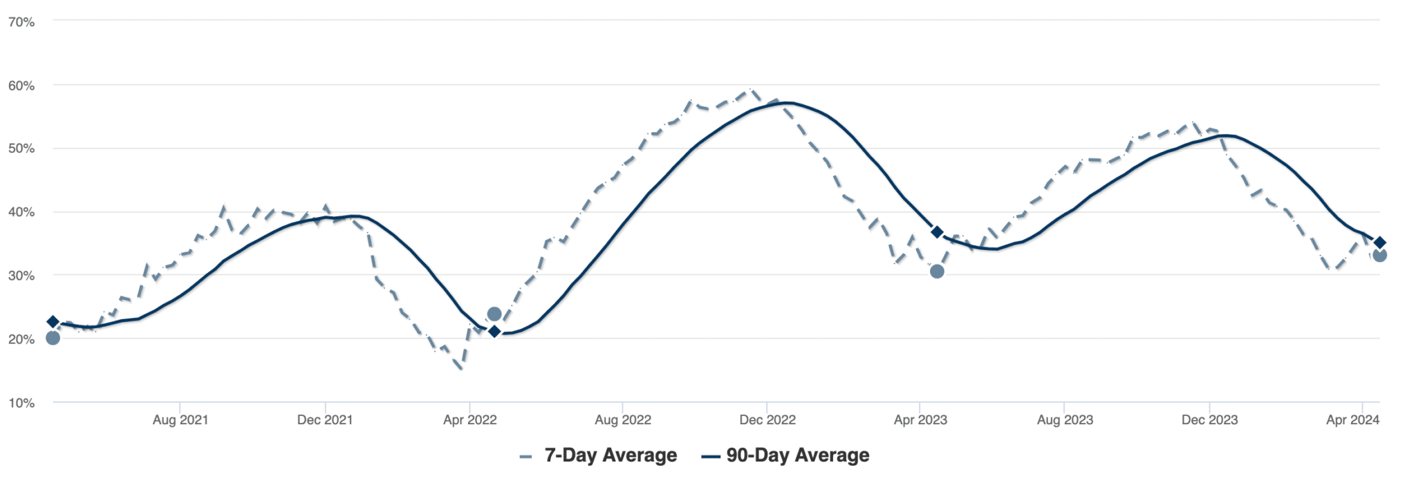 In April, the amount of listed homes that have undergone price decreases remains at the same level as our last report – 33%. The still-high number of active homebuyers combined with low available home inventory is working in favor of sellers to keep competition and prices high. However, we are seeing signs that the market is beginning to slow, including a slight reduction in buyer traffic and a small increase in home inventory. These factors will eventually lead to downward pressure on prices if they continue as we expect them to over the next several months.