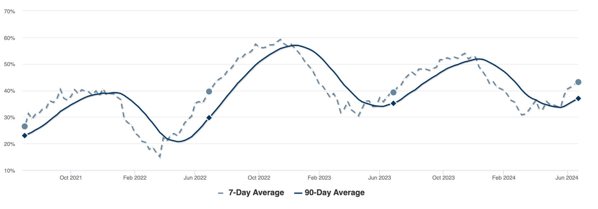 As we predicted last month, the number of homes on the market that have had to drop in price has begun to increase after remaining fairly consistent through Spring. The combined factors of a decrease in interested home buyers and continually increasing home inventory are leading sellers to start lowering their prices in order to appeal to buyers. Currently, 43% of listed homes are now undergoing price drops. As you can see on the chart above, the consistent annual trend is for this percentage to continue to increase through the end of the year. We expect that this year will be no exception, with a growing percentage of price drops in July that continues to increase through the month of December.