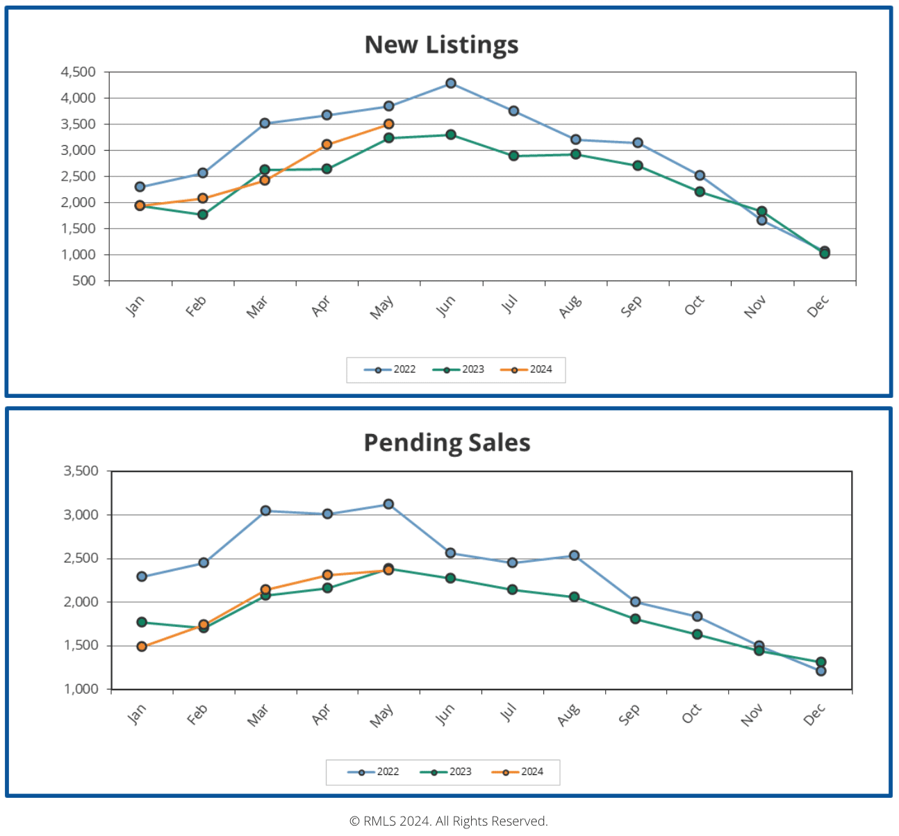 Pending sales rose only slightly in May to match the level of sales in 2023, yet the trajectory of sales for the year remains far below that of 2022. Because our local housing market has reached its annual peak in sales for the year, we anticipate that sales will begin to drop off through the Summer months.