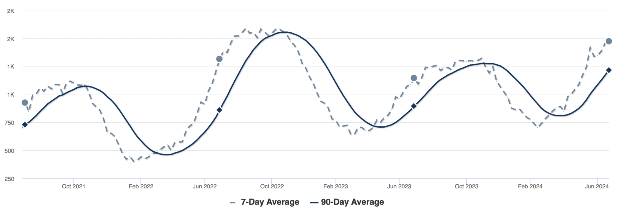 Average home prices, calculated by price per square foot, have remained relatively constant since the beginning of March. As shown on the chart above, home prices remain higher than in 2023 but are slightly lower than the peak in market prices we saw in 2022. With less competition from fewer interested buyers leading to increasing price drops, we anticipate a decrease in average prices in the very near future.