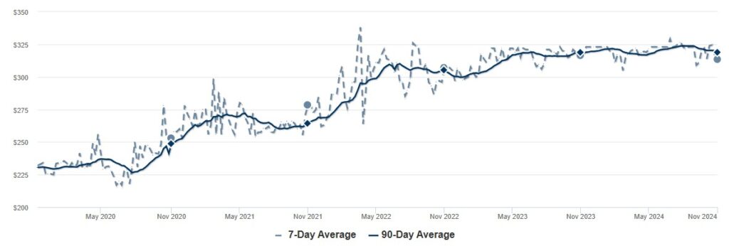 Currently, the price per square foot averages $313. In our time in the Oregon real estate market, we have found that the price per square foot is the best source for price comparisons. Prices have leveled out at this point this year and in 2023 vs. the fluctuations in previous years. Inventory has remained higher the last two years, keeping prices from rising, but those sellers have also avoided dramatically reducing their prices in order to sell. The sellers are mostly holding out, waiting for the market to improve, or waiting longer time periods to get the price they want.
