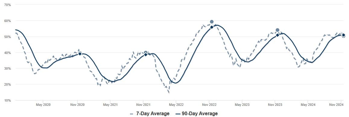 As of November, the percentage of listings with price reductions since September has remained relatively steady at 50%. When following prior trends, we can expect the percentage rate to rise or at least hold steady until dipping in January. The 50% percentage this year is slightly lower than in 2023.