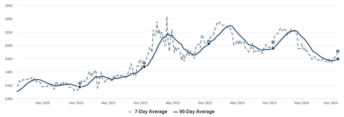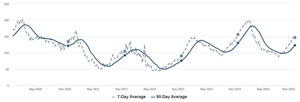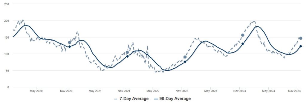 According to Fidelity National Title, Lake Oswego’s housing inventory has decreased to 122 listings, following the seasonal pattern of active listings decreasing as of late November. It also aligns with Portland’s overall inventory trends, which also saw declines from October to November, dropping from 1,558 to 1,305 active listings. During this time of year, fewer homes come onto the market.