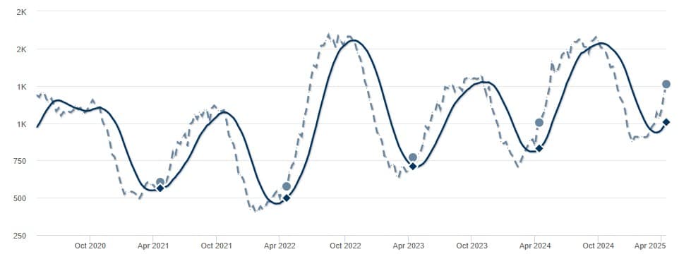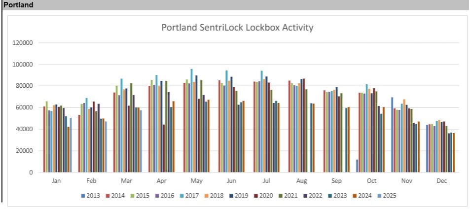 Buyer traffic for 2025 mirrors the traditional seasonal patterns in Portland. Activity is much softer than in the peak years of 2021 and 2022, but it is stable. SentriLock lockbox data through March 2025 shows consistent buyer engagement, continuing into the spring market.