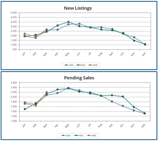 For pending sales, we are seeing stability. March 2025 saw 2,199 pending sales, up 2.9% over last year’s total of 2,138 for the same period. Pending sales trends have remained relatively consistent year over year, reflecting steady buyer demand even with slightly higher inventory levels. Again, we should see more pending sales into May and a slight dip in June.