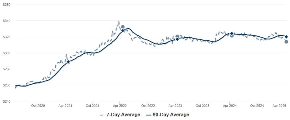 We like to use Fidelity’s price-per-square-foot data for the best read on home values. As of April 18, 2025, the average price per square foot in Portland was $313. This is slightly lower than the $321 reported in April 2024 and $317 in April 2023, indicating only minor fluctuations over the past two years, despite changes in inventory and buyer traffic. The steady pricing reflects a healthy demand for homes even in a time of higher inventory levels.