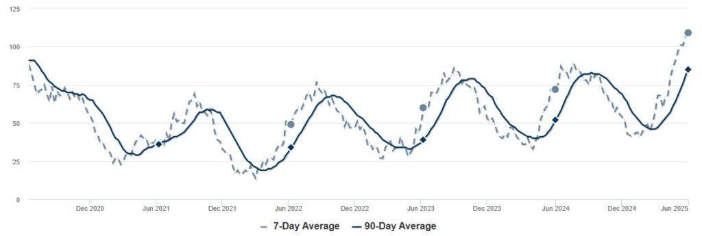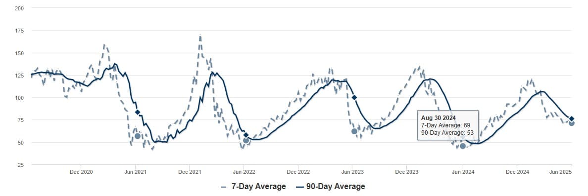 As of June 6, 2025, the average number of days on the West Linn market continues to follow its seasonal decline into August. We are currently in the busiest selling season, so this trend is not surprising. However, we are higher than at this time last year (71 days vs. 45 days, respectively). The city’s history appears to follow an up-and-down pattern when comparing similar times of the year. Combined with the higher inventory and lower home values, we can likely expect the average days on the market to remain elevated for 2025 and into early 2026.