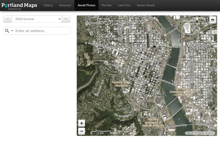 - Aerial Photos: This tab allows you to see different aerial photos of Portland, OR, across the years, allowing you to see how various properties have changed over time.