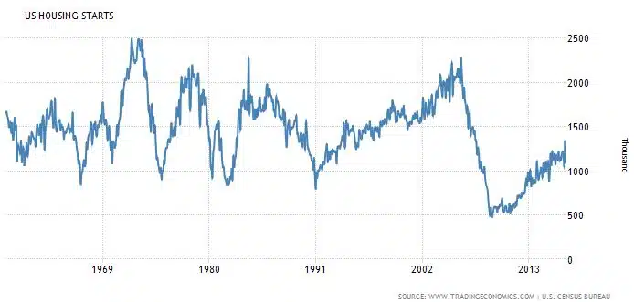 - Basic supply verses demand. New home construction will stay conservative (while slowly rising) and is still historically low after the bubble crashed in 2008. You can tell from the below chart from the U.S. Census Bureau that new construction homes were built at a rate around 1,500,000 a year and in 2017, Forisk Research predicts new construction will hit or get close to that average mark. Forisk Research predicts that home builders will remain conservative despite increased demand for housing.